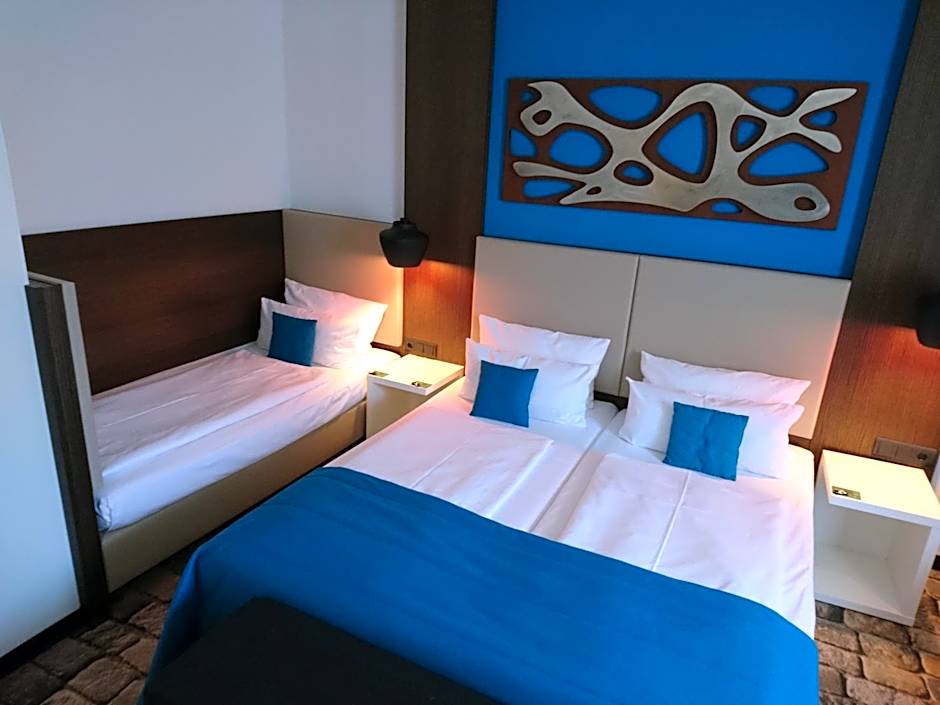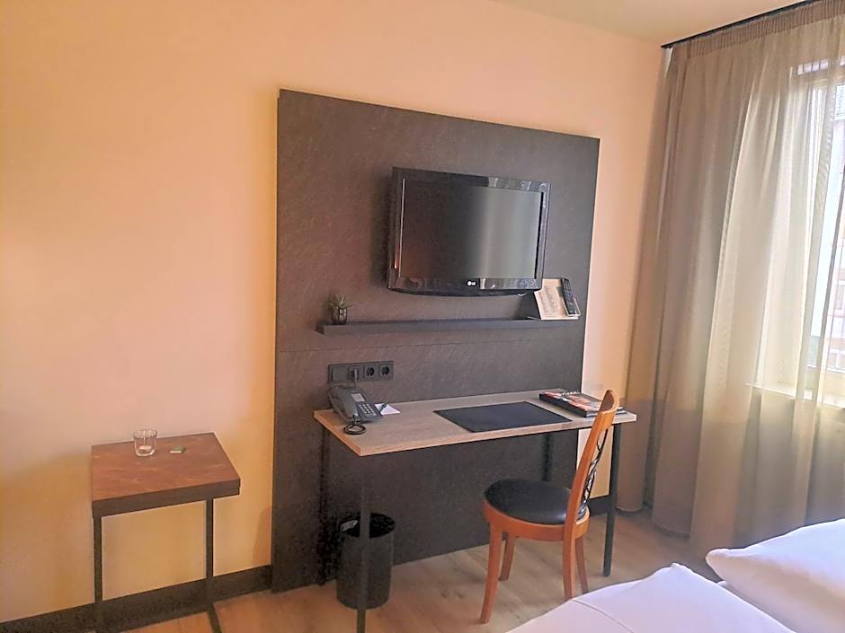 Nice 4 Star hotel 15min walking distance from Zeil. The staff where all very nice and helpful. The room was good; double bed with spectate mattresses. Bathroom with toilet/ shower, small vanity kit. The room is of good size and you can move freely and there a place for your luggage. The also has a small balcony. My room didn’t have a water kettle, but when I asked the staff, they gave me a kettle with tea and coffee for free. The hotels lactation is good; nice safe neighborhood close to down town and shopping area, Zeil is in walking g distance. The area has restaurant and bars. Over all a great place to stay.