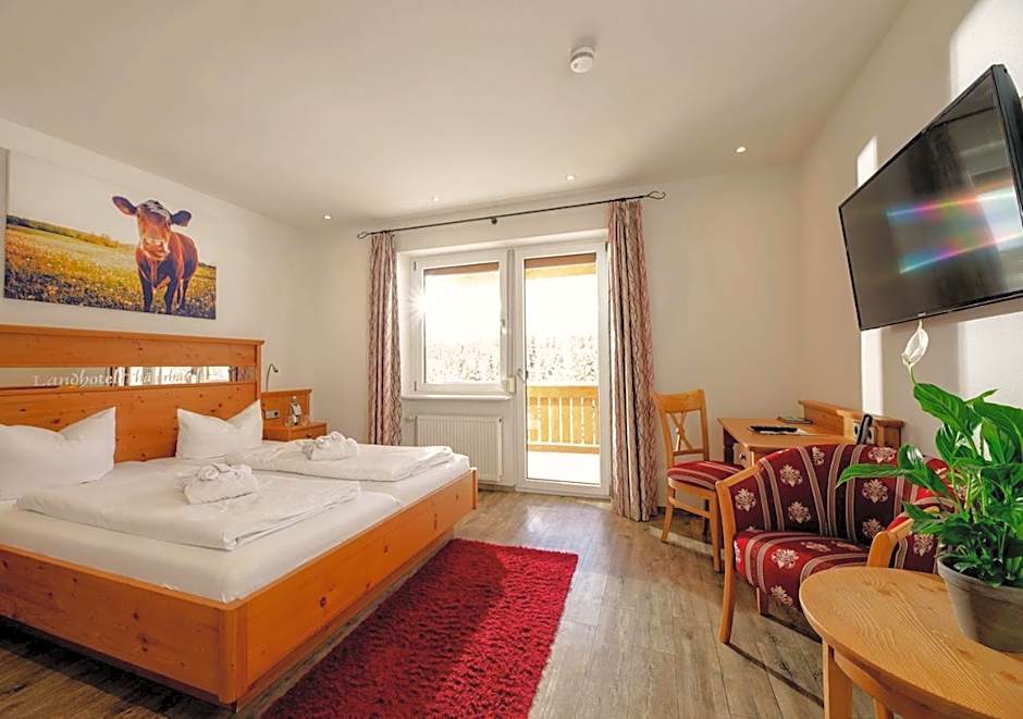 The location was rural situated on the edge of forest. Very quiet and peaceful. The room was excellent with a balcony overlooking pastureland and hillside. Breakfast was outstanding with lots of choice on a buffet style, but you could also have a hot breakfast as well, made fresh at no extra charge. The restaurant in the evening had a good selection on the menu with dishes of the day. The food was delicious and generous in portions. All the staff were friendly and gave advice on where to go in the area. There were walks close to the hotel through forest and meadows.