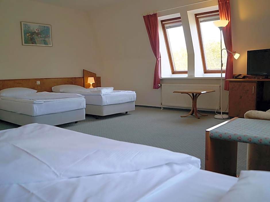 The triple room features a wardrobe, a carpeted floor, as well as a private bathroom featuring a shower and a hairdryer. The spacious triple room provides soundproof walls, a seating area, a dining area, a TV with satellite channels, as well as garden views. The unit offers 3 beds.
