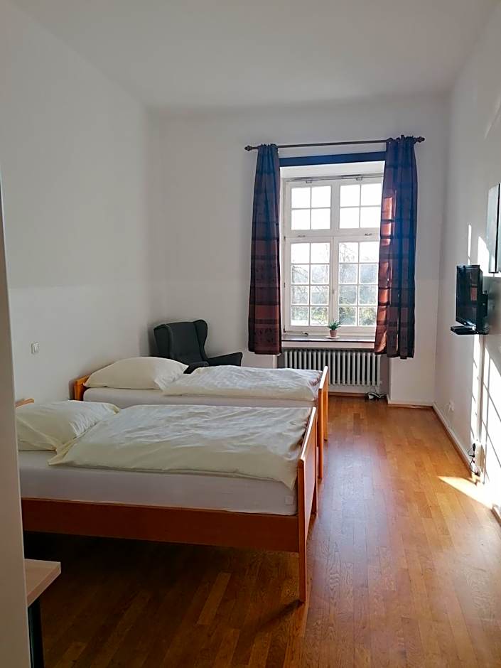 It is an excellent accommodation to have a quiet and relaxing stay-over in an unusual setting. The accommodation is very well-maintained and has in imposing atmosphere. The wooden bed is simple, with an excellent mattress which gave us a relaxing sleep. The room is simply furnished, although well-functional and large. The bathroom is also simple, but functional and clean. The restaurant seems to be popular among those living in the neighborhood and nearby cities, especially its beer garden when sunny and warm. The large garden is inviting for a calm walk. The accommodation operates with a minumum of personnel, which gives a calm atmosphere.