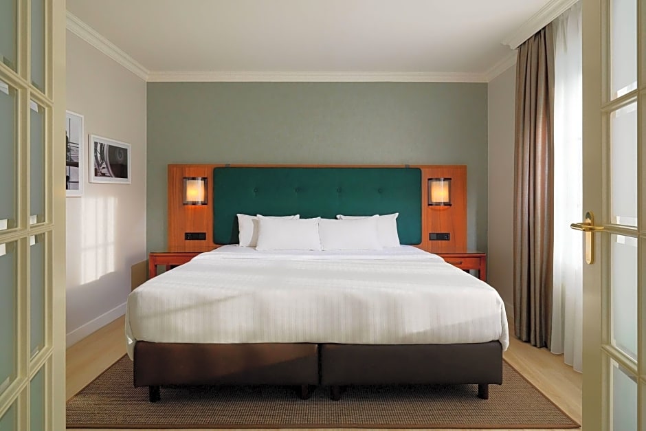 The Courtyard by Marriott Hamburg Airport offers a variety of room types including Suites, Double rooms, and TwinDouble rooms. The Suites are spacious with an average size of 495 sqft, accommodating up to 4 adults and 3 children. These rooms feature a King size bed and a sofa bed. The Double and TwinDouble rooms are smaller, ranging from 258 sqft to 323 sqft, and can accommodate 2 adults and 1 child. These rooms feature either Twin beds or a Queen or King size bed. All rooms are non-smoking.