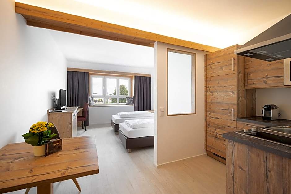 Small hotel in a residential location with plenty of available parking either at the rear of the building or in private parking garage. Easily accessible by car from Munich and surrounding tourist areas with small shops and bakeries within walking distance. Apartments were spacious, clean, comfortable and quiet. Staff were very friendly and accommodating in answering questions and kindly accepting deliveries on our behalf.