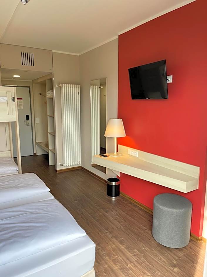 Situated just off the autobahn so very easy to find. Really helpful reception staff, who cope well in a busy environment. There was a small problem checking in which was quickly sorted. The room and shower room was clean, nice view over to the mountains. Dog friendly hotel. Great price and we were able to check out very early.