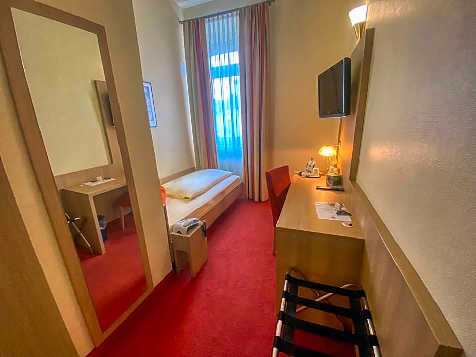 Attractive room with free Wi-Fi, a flat-screen TV, free calls within Germany and a free bottle of mineral water daily. The shower is directly in the room, the toilet is an extra room. All these rooms face the street!!! No extra bed is possible in this room category.