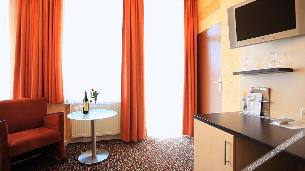 The location of this hotel is amazing.It is right next to the train stop and you can get a ticket for free usage of public transport at the reception for the time of your stay. It is close to most of the city attractions. The view was amazing( of the Friedenkirche). The room was spacious and clean. It may not be really modern, but good for the price. The staff was friendly and helping.