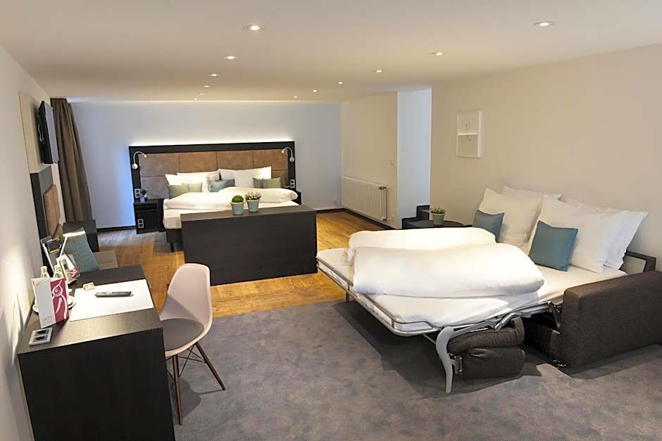 After a busy day of exploring the vibrant city of Köln, you'll find solace in the comfortable and modern rooms at UHU Gästehaus Superior. The Deluxe Double Room offers a spacious 431 square feet of space, making it perfect for a family of four adults and three children. With a luxurious king-size bed and soundproof walls, you'll be sure to enjoy a peaceful night's sleep.