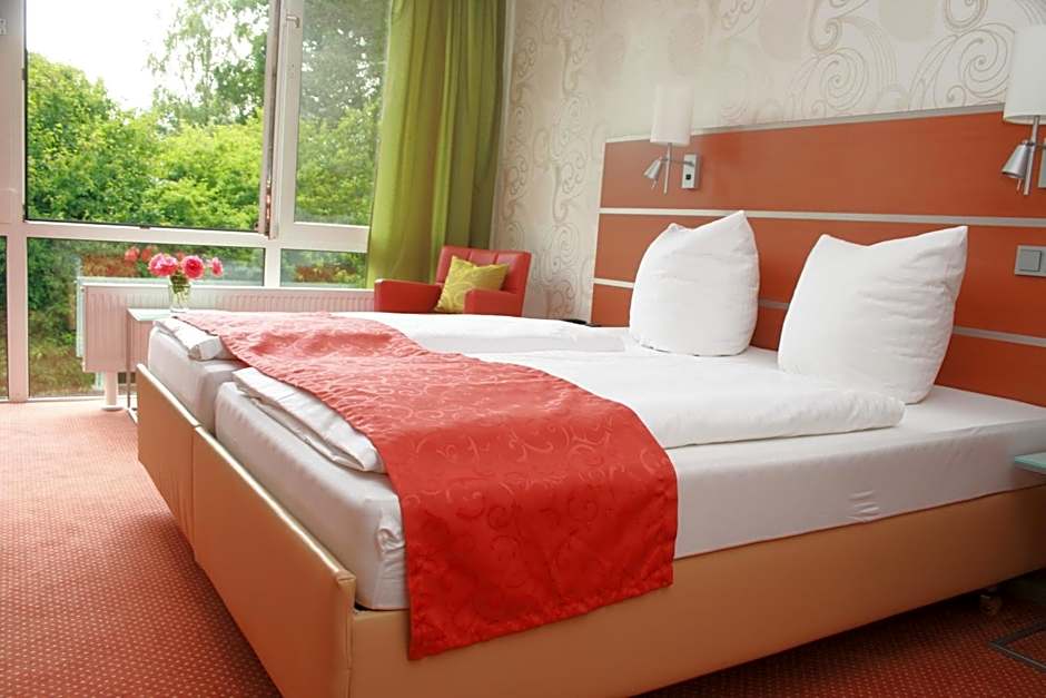 The hotel is located in a village not far from Marburg, very quiet place. There is a big garden around, very green. It's amazing to have a relaxing time. The restaurant is very nice, with natural beautiful flowers all around. We loved the food and the breakfast. The size of the room is an average. I would say a good size. The same to the bathroom. It's 2 single beds put together. The mattress is soft and comfortable. Everything is very clean. Internet is fast enough and works fine. The staff is amazing!