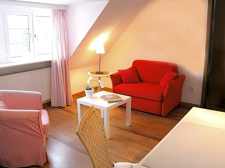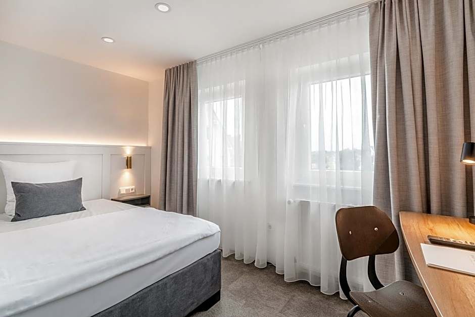 We loved the hotel which has been modernised to a good standard. Really liked the rooms which were bright, airy and modern - devided into a spacious bedroom and a work station area. Great artwork on the walls. The bed was large, really comfortable mattress and lovely bedding. Bathroom was modern and spacious with a good shower. The communal areas were still being completed in the modernisation programme but this did not affect our stay. Especially loved the bier garten as it was a lovely sunny day - this attracted a lot of local people so a friendly atmosphere without a hotel feel. Great breakfast in the morning. Friendly and welcoming staff. Would definitely visit again.