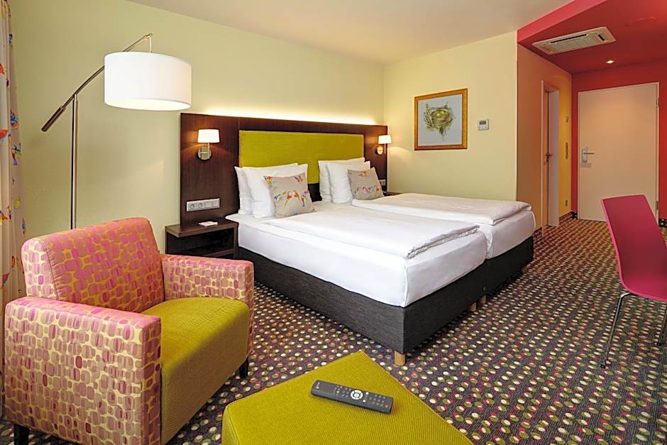 The Trans World Hotel Kranichhöhe offers two types of rooms: Superior Twin Room and Standard Comfort Twin Room. Both room types have a size of 194 sqft and smoking is not allowed. They can accommodate 2 adults and 1 child, with each room having 2 twin beds.