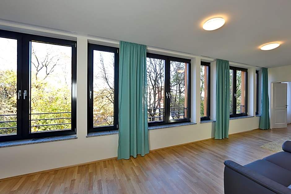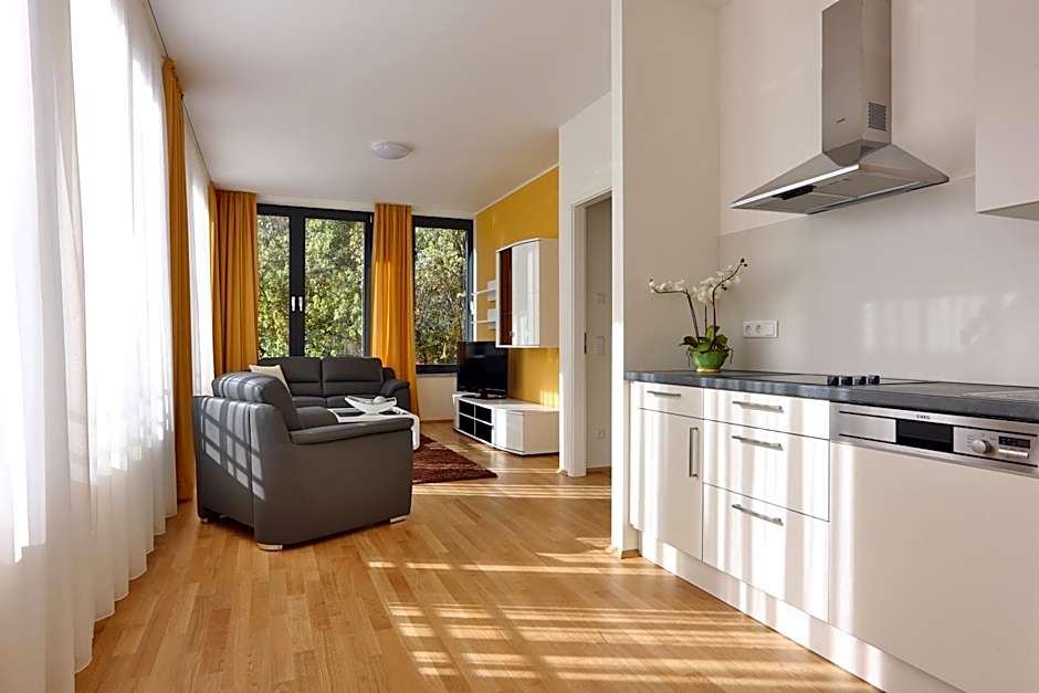 It's a great place for staying longer than one week. I lived here for two weeks for a business trip. It's a very quiet place with a nice view. The apartment I chose has windows on the west and north sides. I can see the woods and grass outside the windows when I am working at the table. The kitchen is small but good enough, and the cooking utensils and tableware are good. There are different cups for white wine, red wine, and beer. I really appreciate the environment surrounding. There is a large garden which can be seen through the north window, and I like to walk into the garden for a while after getting up, before going to sleep, after taking food, or after working an hour... There is a nice cafe and restaurant on the way to the garden, which can also be seen through the north window. It worked there for some time, good coffee, beer, and food. A Edeka supermarket is located on the west side, a few minutes walk, very convenient for buying food for cooking. A REWE supermarket is located on the south side, 5 5-minute walk. The Olympic Garden is on the west, a little far, but still within walking distance. The public transportation is very convenient. A bus line just outside Edeka, and many lines near the REWE. The most important thing is that the managers Frank and Ralph are very nice people, very helpful.