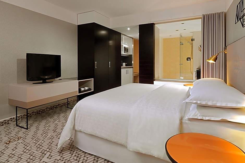 This spacious suite is consisted of of a kitchenette, a seating area, 1 separate bedroom and 1 bathroom with a bath and a shower. The fully equipped kitchenette features a stovetop, kitchenware and a microwave. The air-conditioned suite offers a flat-screen TV, a tea and coffee maker, a dining area, a wardrobe as well as city views. The unit offers 2 beds.
