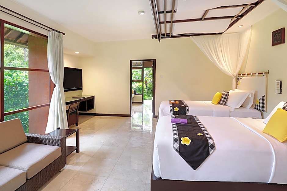 DELUXE BEACH BUNGALOW is 646 square feet and includes either a queen-size bed 150-154 width or 2 single beds 80-130 width plus terrace, hairdryer, tea and coffee making facilities , safe, bathrobes, and slippers.