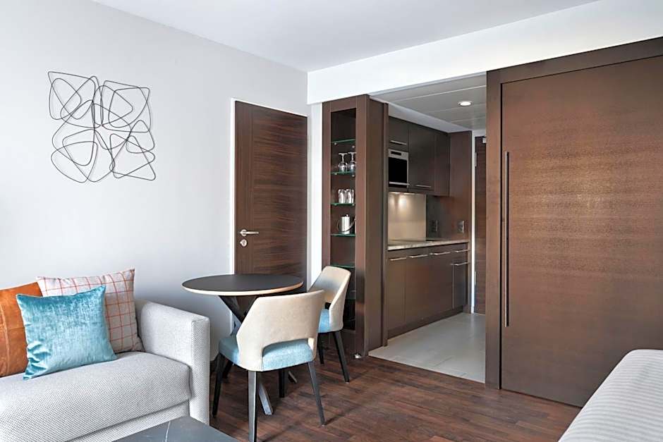 Contemporary-style studio featuring a fully equipped kitchen with a dishwasher. A living area with a sofa, a dining area and a work desk are also included.