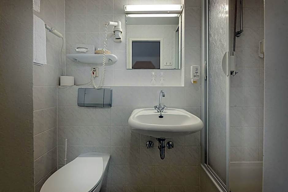 Simply furnished room with a satellite TV and private bathroom with a hairdryer.