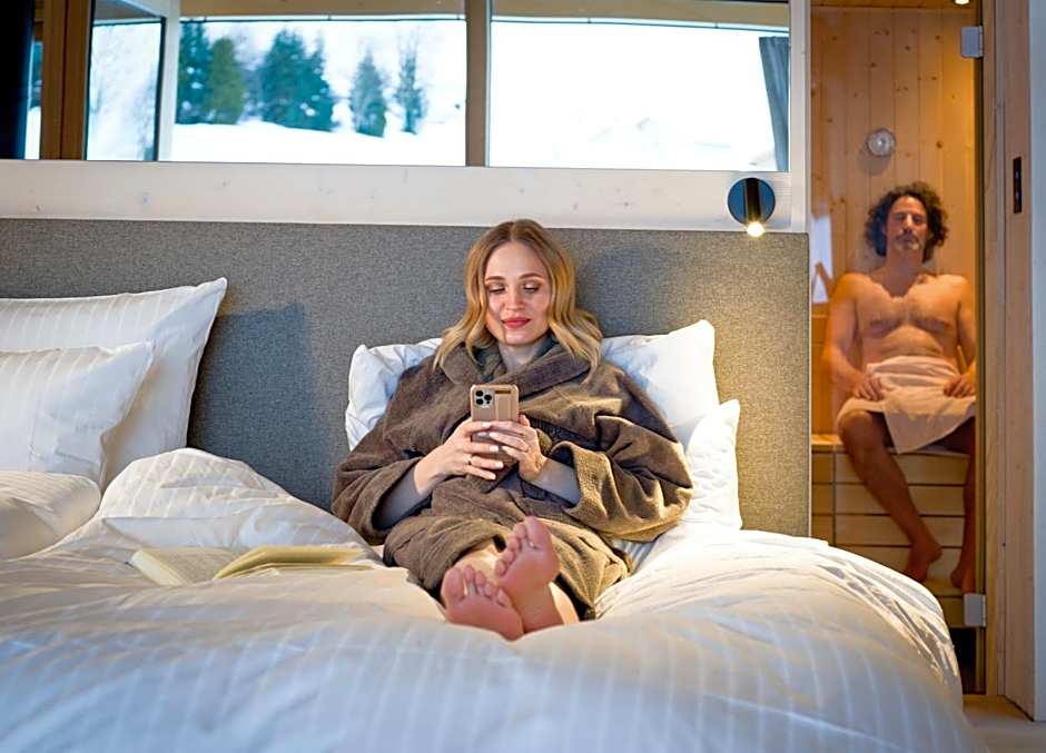 After a day among the peaks, unwind in an indoor heated pool with a view, available year-round for a quiet dip. A sauna, steam room, sun deck, and terrace provide extra spaces to recharge, while soundproof rooms and a private balcony offer restful retreats after mountain adventures.