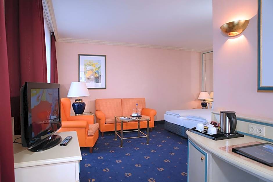 Large and elegantly decorated room with a seating area and either air conditioning or a balcony. Free mineral water is provided in the room on arrival.