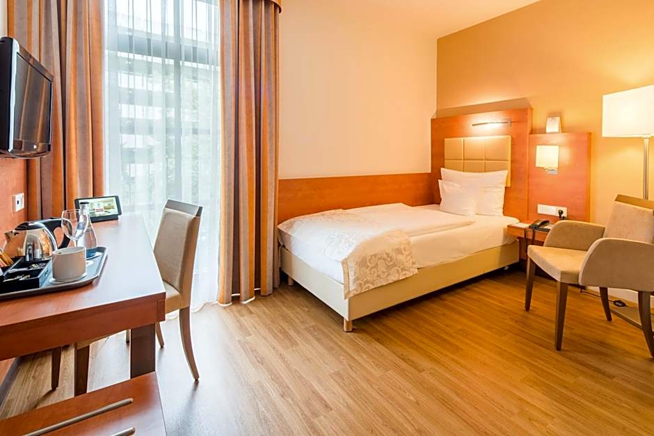 We stayed here while doing a bicycle tour on the Neckartalradweg. Although it's mainly a business hotel, it is bike friendly and has a securely locked bike storage area in the parking garage. The hotel is easily accessed from the bike route via bike lanes on the nearby streets. Our three-person room was large and nicely appointed, and the air conditioning was welcome at the end of a hot day of bicycling. The front desk staff was friendly and compentent, checking us in quickly and answering our local-area questions. Breakfast is very expensive (20 euro/person I think), so we skipped it. The main part of town is a short walk from the hotel. For dinner we ate at Schlachthof Bräu, which is highly recommended. Good food and a nice biergarten area (also good inside seating).