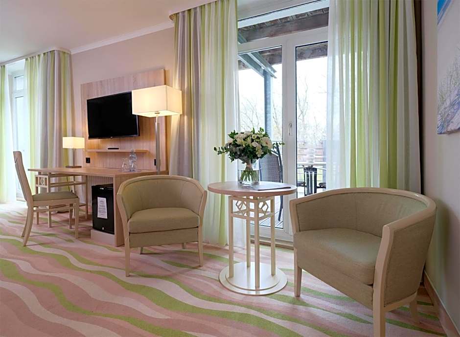 At Seehotel Grossherzog von Mecklenburg, guests can spend their time enjoying various leisure amenities. They can relax and rejuvenate with spa and wellness packages, as well as access the indoor swimming pool, Turkish/Steam Bath, steam room, sauna, and spa. The hotel is located beachfront, offering guests the opportunity to lounge on the beach chairs. Guests can also engage in outdoor activities such as mini golf, bicycle rental, bike tours, horseback riding, cycling, hiking, and fishing.