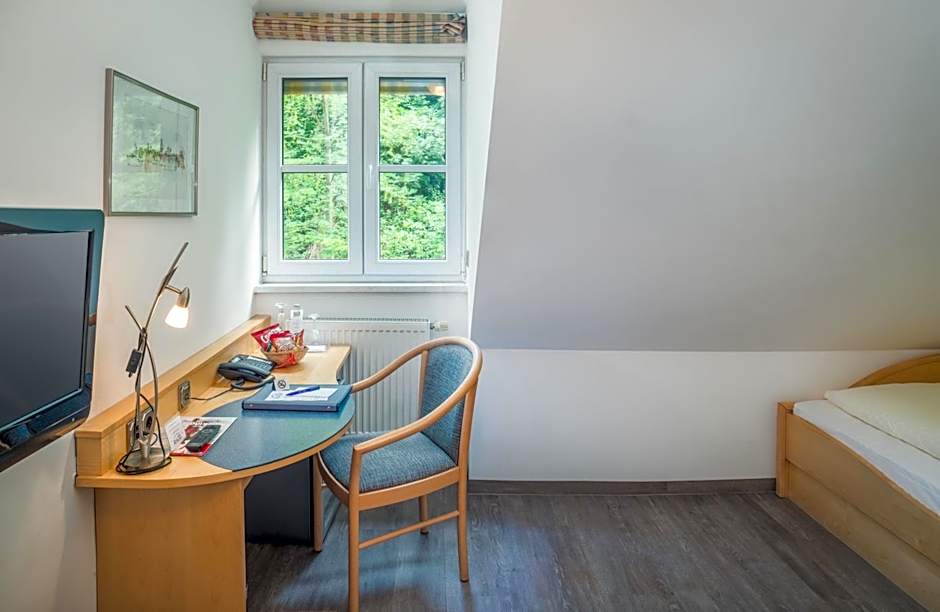 Proximity to autobahn, proximity to city centre (about 15 minutes walk), good sized room, good breakfast. There is paid parking available. Contrary to other comments, it is accessible if you're halfway able to drive a car. The only restriction would be if the car is a very low sports car as the path down to the parking is quite steep. Also there is probably a height restriction, so larger vehicles might not fit. Best to ring and check in advance.