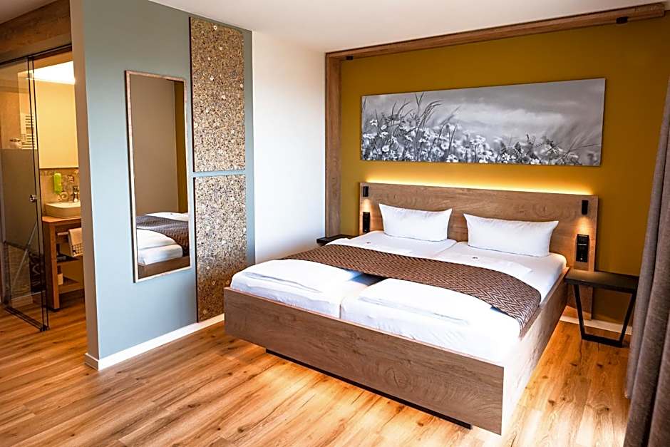 This room category has been completely refurbished in 2023 and is equipped with a wooden floor and a glass door to the bathroom. The room has a balcony with a view to the rhine valley.