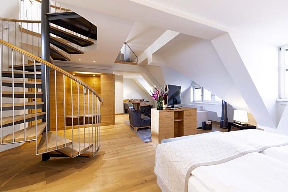 This suite is located under the roof and has a view of Steinweg, the pedestrian zone of Hamburg. It has a parquet floor. There is a seating area with a sofa and a breakfast table. The bathroom features a shower and a bathtub.