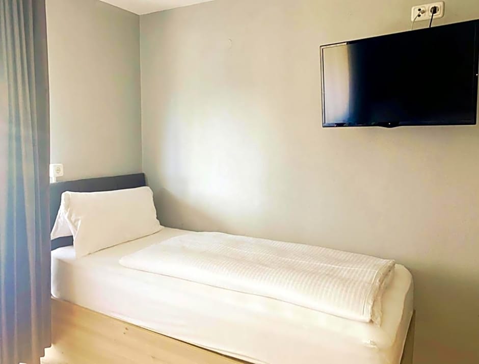 Room options include a 129-square-foot Double Room with a queen bed for 2 adults and 1 child, a 129-square-foot Single Room with a twin bed for 1 adult and 1 child, and a Room - 2 Twin (bed details not specified). All options are non-smoking and provide practical layouts for travelers seeking comfort and value.