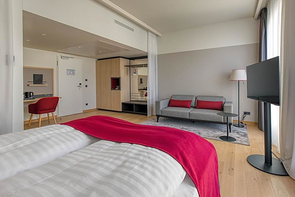 We stayed as a family of three and there was an extra bed for our son set up. I've stayed here before and it's an excellent location right by the airport terminal. The price made it very worthwhile as well. There are food options in the lobby which we didn't try but the prices seemed reasonable, and be aware there are very few decent food options in the airport terminal itself if you need dinner etc. Train station is right out the front door. Online check in made the process quick and easy - literally took about 30 seconds to receive our key. The room is comfortable and while not huge, it was perfect for a short stay near the airport and is well appointed and modern.