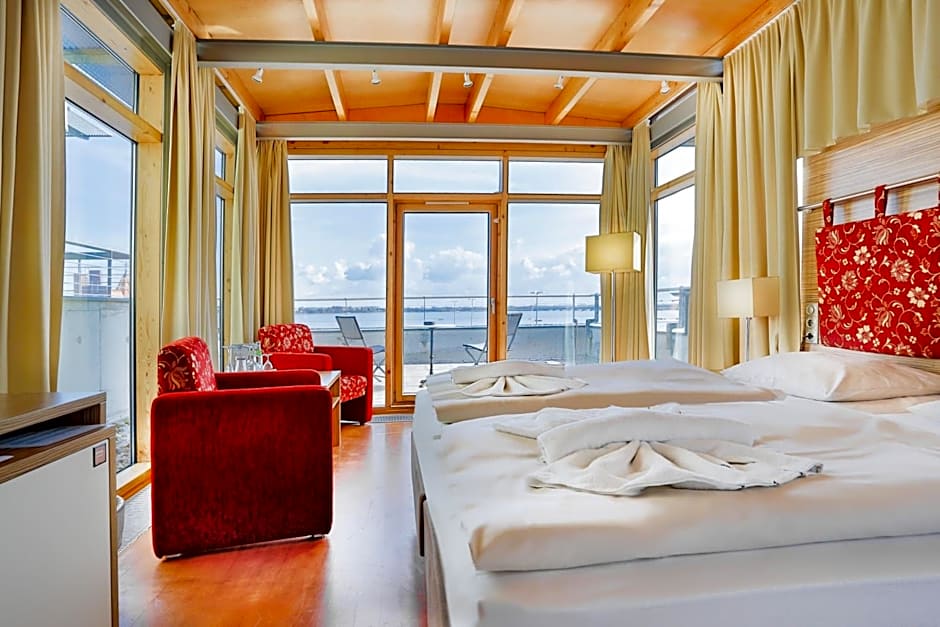 We had a room overlooking the wharf area with a beautiful view of the water and marina. Loved the location and proximal ease in walking to restaurants. Lisa, at the reception desk helped us tremendously in locating a bike rental business and securing 2 bikes for us. Since we weren't fluent in German we were so grateful to her for assisting us.