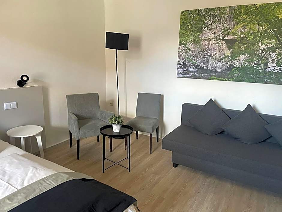 Charming little country hotel with tastefully decorated comfortable rooms, a good restaurant and pretty gardens with own small pool. Reasonable price given location and all amenities. Outside terrace and beer garden. Friendly and helpful staff! Situated in a quiet village just off road , minutes from Thale central it has all the benefits of being close to.all amenities in Thale without the bustle! ..I stayed in the "Gästehaus" annexe area which is very dog friendly and there are nice quiet walks immediately around hotel. Would have stayed a few more nights gif it hadn't been fully booked!