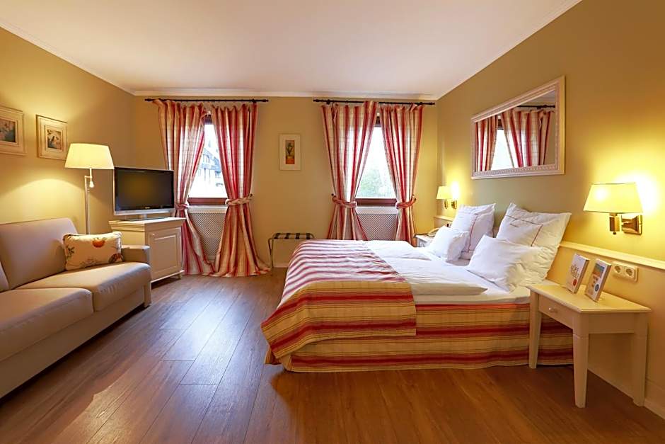 Elegant, country-style room with Wi-Fi. This spacious room features a double bed with separate mattresses and a large seating area. Some rooms are located on the top floor and feature sloping roofs.