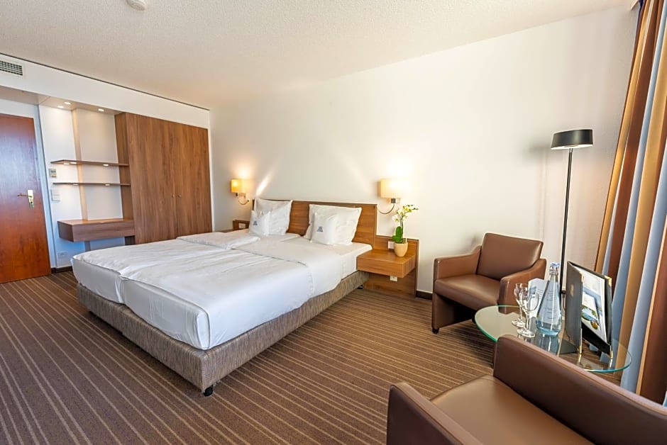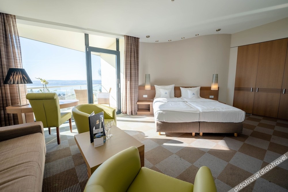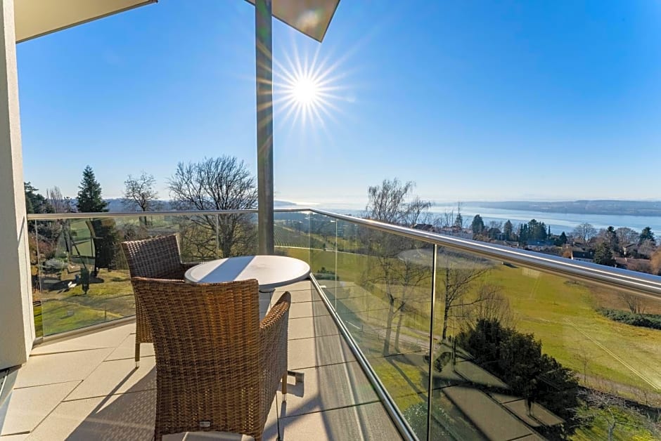 The hotel offers a variety of rooms including Panorama Rooms with Lake View, Family Rooms with Garden or Lake View, Comfort Double Rooms with Lake View, Single Rooms facing Lake Constance or countryside, Panorama Suites, Business Double Rooms, Lake Constance Suites, and Junior Suites. All rooms are non-smoking and can accommodate either 2 adults and 1 child or 1 adult and no children. Bed sizes range from Twin to Queen, depending on the room type.