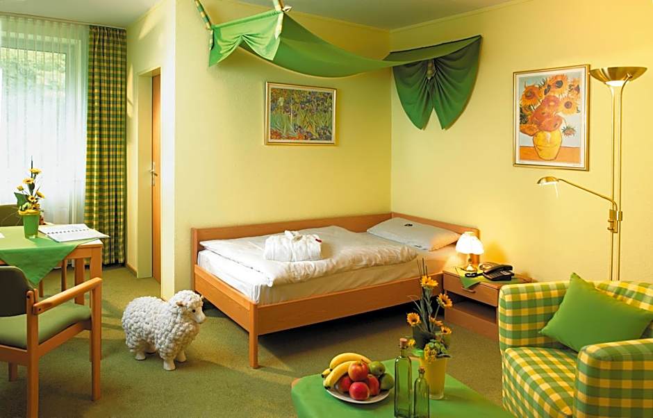 Guests at Moorland Hotel am Senkelteich can enjoy a variety of leisure amenities during their stay. They can relax and unwind in the sauna or on the sun deck, perfect for soaking up the sun. For those who prefer more active pursuits, the hotel offers the opportunity to go cycling, hiking, play darts, or enjoy a game of ping-pong.