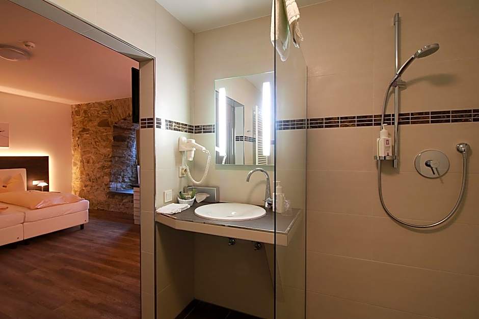Safe undercover bike storage in a locked cellar easily accessible and near the elevator at the night entrance. Good air conditioning with individual control. Block-out shutters and safety barriers on traditional windows. Our third floor room had a lovely view over the Lahn River and bridge. Safe, kettle and refrigerator in room; with a small table and two comfortable chairs. Good modern bench space, wardrobe space and luggage storage, and carpeting. Large modern bathroom. Good quality smart TV. Easy walk to the schloss next door, and local restaurants. Friendly helpful staff (until departure).