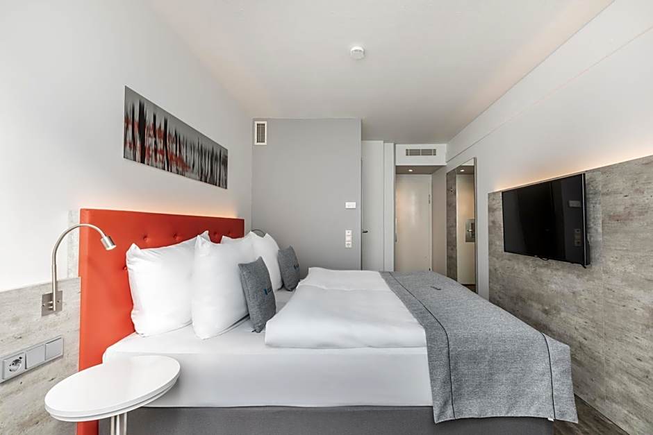 The air conditioning didn't seem to have any effect on the room temperature. It was a little warm even in early spring, and I couldn't leave the window open as it gave out onto a flat roof, accessible from other rooms on the first floor. I missed having a kettle in the room, but this cannot be expected in German budget hotels. What would be nice would be free tea and coffee in the lobby, as can be found in some budget hotels. (Tea or coffee can be purchased at the bar for €2,80.) The bathroom is tiny and the shower cabin is quite tight, even for a fairly petite person, but once you're in, it all functions very well.