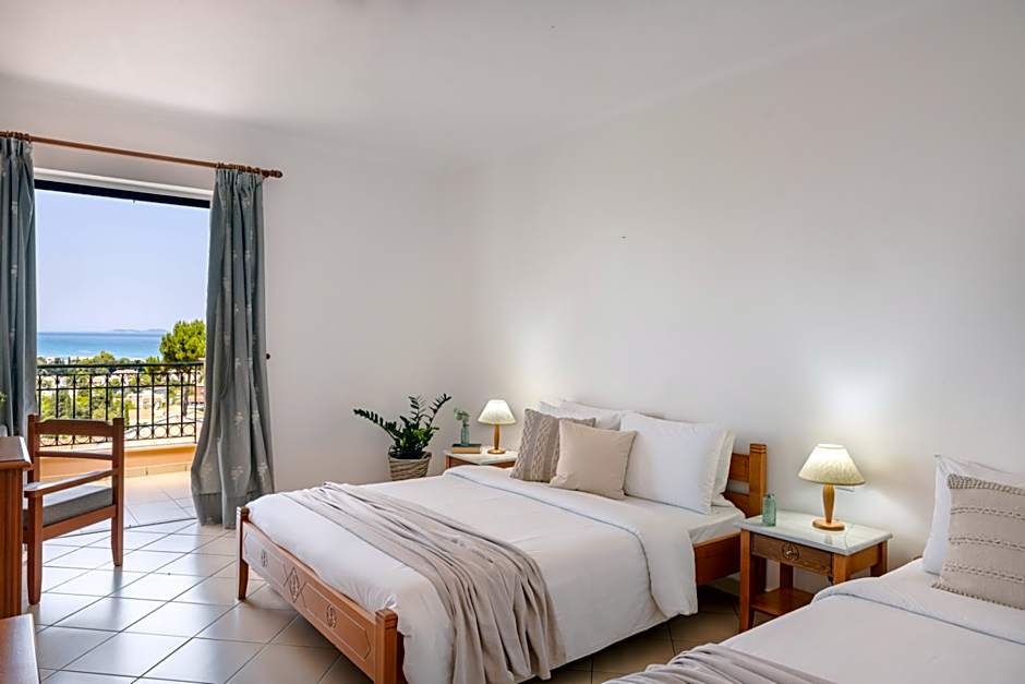 Great location, spacious complex on a gentle hill so all the apartments had lovely views. Very large apartment type accommodation. Good WiFi. Varied breakfast every day. Quite a few people staying but always quiet and peaceful. All staff were great. Felt like family. Pool was large and warm. Never any issues in getting a lounger. Town centre five min walk. Beach max ten min. Touristy Greek Night was good fun with tasty buffet. Fat e-bike rental just outside the hotel. Well worth taking one for the day to see the beaches and countryside.