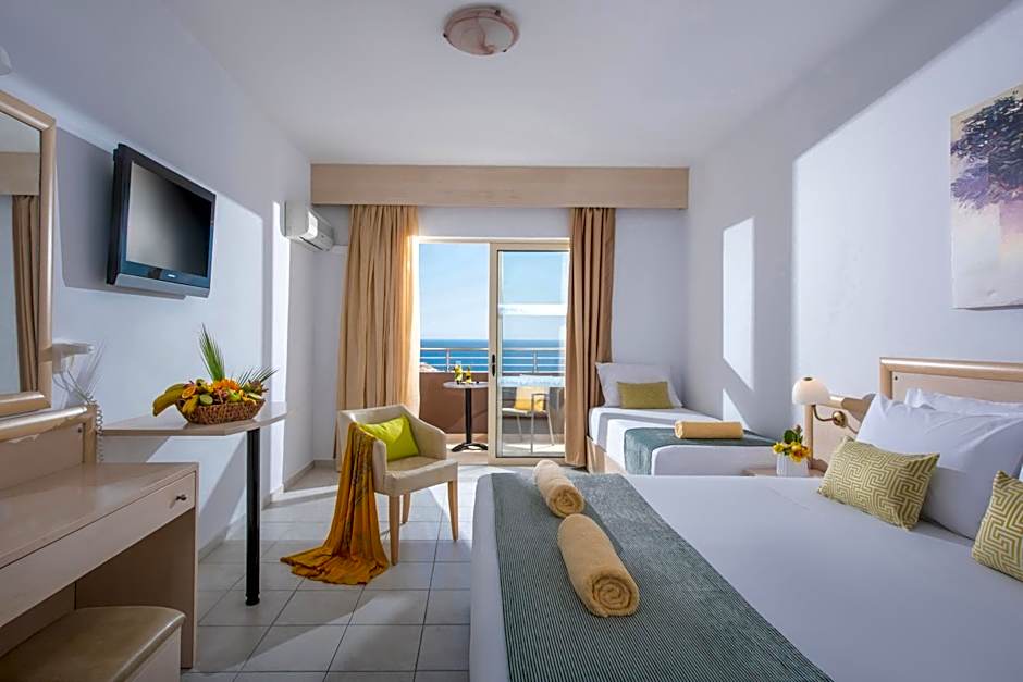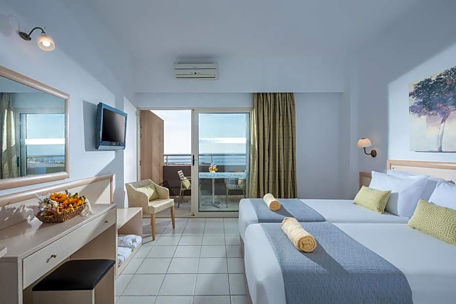 This 2-bedroom room is located in an annex building and offers 2 spacious separate bedrooms. Its furnished balcony offers uninterrupted views to the Cretan Sea. All rooms are equipped with a 32" LCD satellite TV and air conditioning. Kindly note that a baby cot is available upon request. Kindly note that room size varies from 30 sq.m. to 33 sq.m.