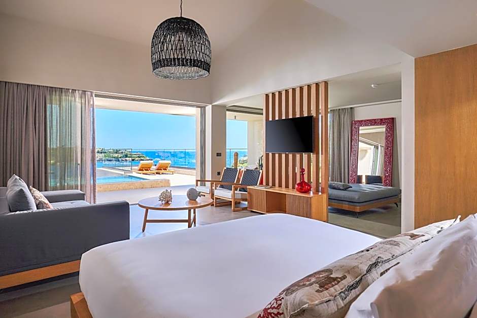 Ruby Suite with plunge pool - sea view is 753 square feet and includes a king-size bed 150-183 width plus a sofa bed and is Wheelchair-accessible.