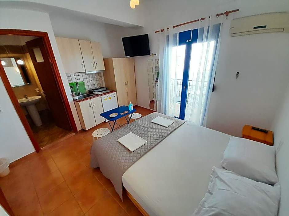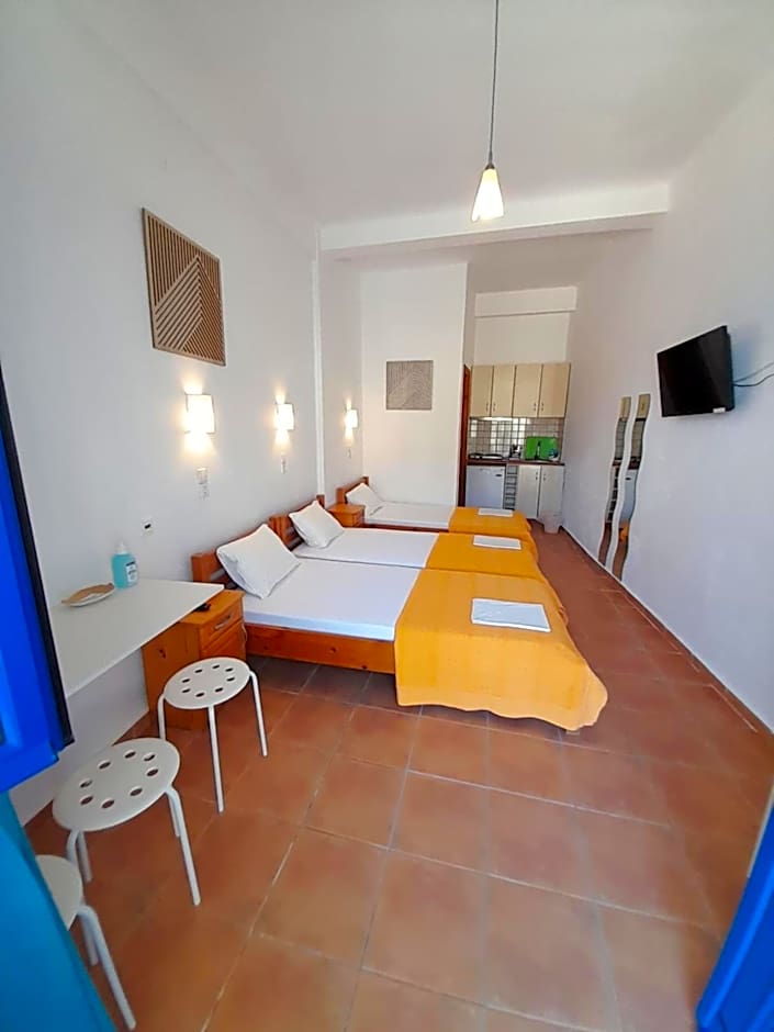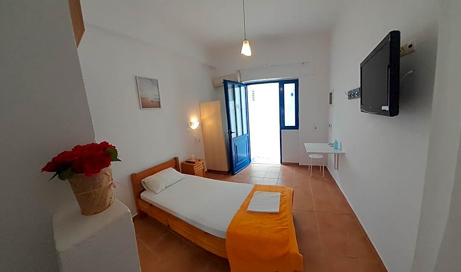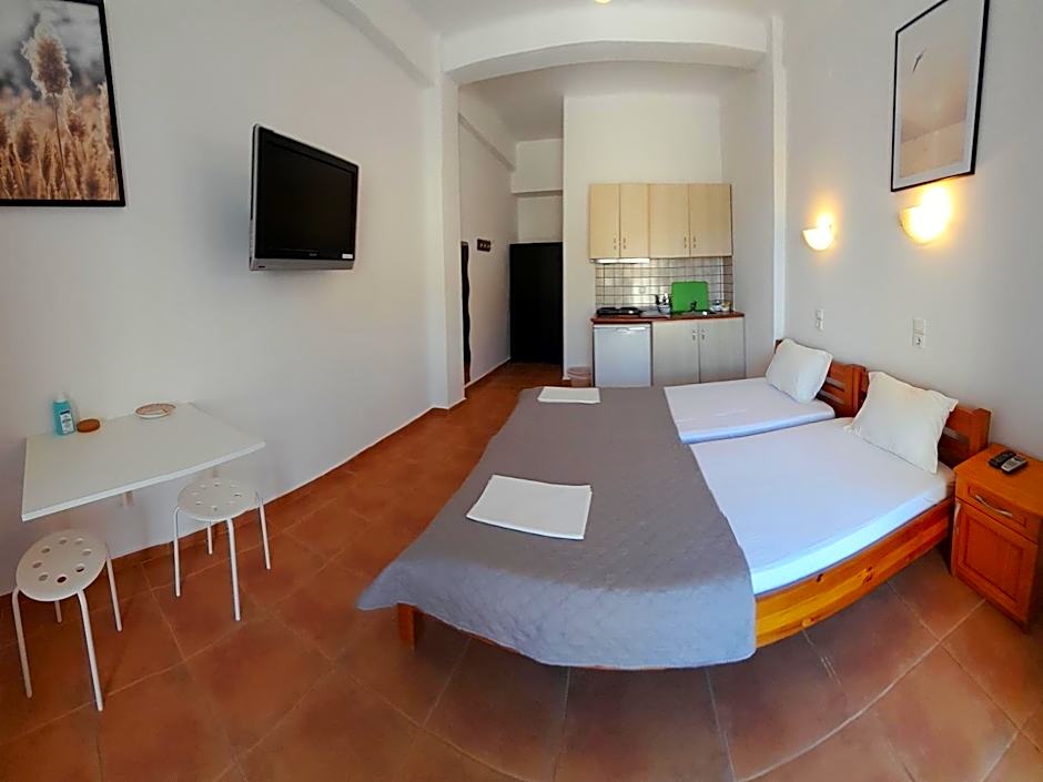 Gorgeous location overlooking the bay from our balcony room. Exceptionally clean with rooms cleaned daily and sheets changed regularly. Small but adequate kitchen area. Hosts very friendly and helpful. Beautiful bay with thermal springs adjacent and numerous restaurants and bars - absolutely perfect location. 20 minute (very scenic but hot) walk over the hill to Agios Kirykos.