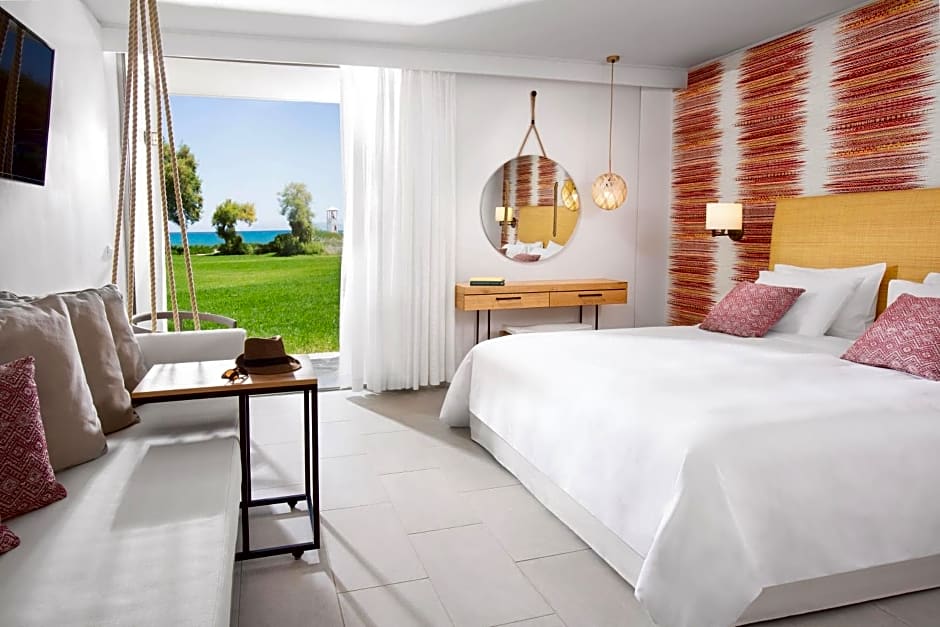 This accommodations type offers glorious sea views, recently renovated in 2025. A warm ambiance offering a twin orking-sized double bed and a spacious walk in shower. Modernly decorated with earthly colors this room type consistsof an open plan spacious room offering the latest technology in home entertainment boasting a 50 inch smart TV anda bathroom that includes a walk in “rain shower” experience. Located on the second floor it is an ideal setting forcouples or couples with a young child. ROOM DETAILS Location: Main building (2nd floor) Size: 23.5 sq yards/ 258 square foot | Nonsmoking room Layout: Open plan with a cozy seating area with a comfortable couch Outdoor area: Private balcony with comfortable sitting area and table, drying rack Occupancy: 3 adults / 1 infant on top of maximum occupancy | Babycot (Free of Charge)