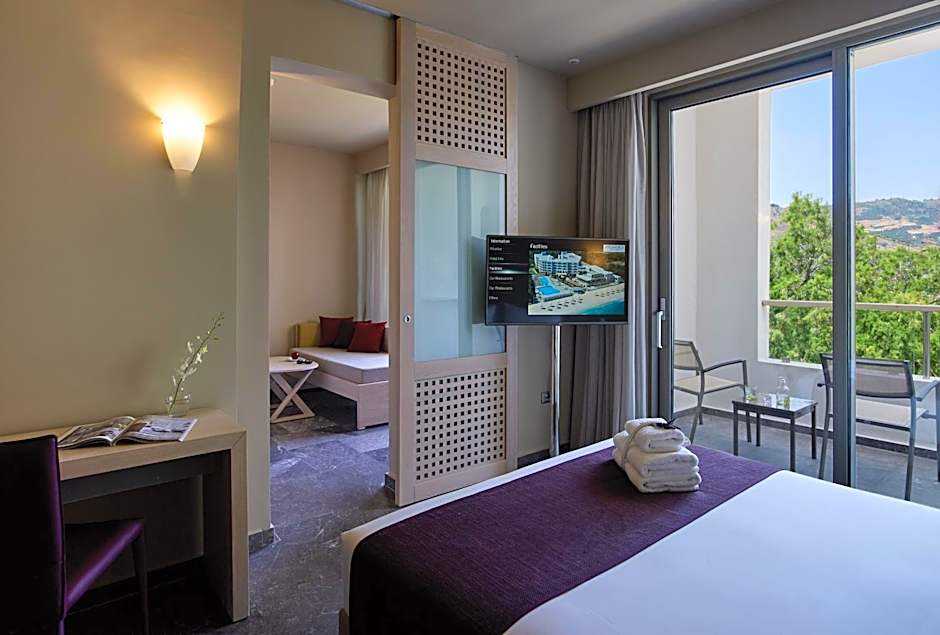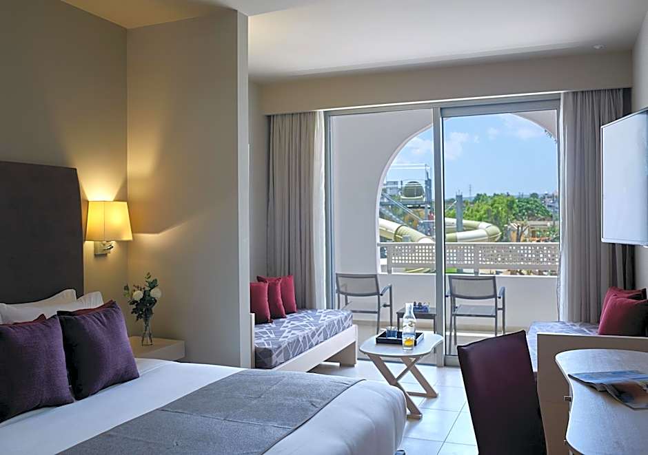 Family Room Inland View | Open Plan is 280 square feet and includes either a double bed 131-150 width or 2 single beds 80-130 width plus 2 sofa beds plus balcony, terrace, extra beds on demand, satellite tv , hairdryer, tea and coffee making facilities , and safe.