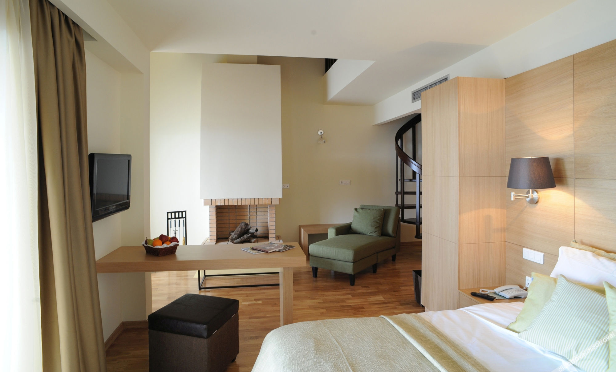 Stylish minimally decorated suite with living room and fireplace. It is equipped with: -free WiFi -air conditioning -satellite LCD TV -laptop-size safety box -slippers and toiletries.