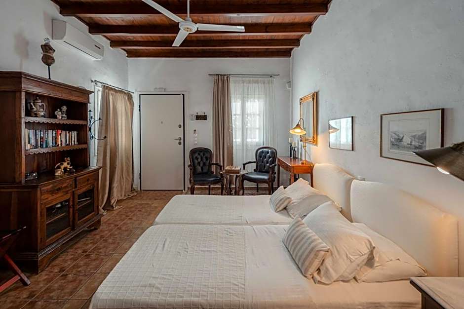 Accommodation options include Deluxe Studio, Deluxe Studio with 2 Twin beds, Apartment with Sea View, and Maisonette with 1 Twin bed. The Deluxe Studio, 2 Twin spans 323 square feet and features a Queen-size bed plus two Twin beds, ideal for groups or families. The Maisonette, 1 Twin offers 484 square feet of space with a Twin bed and a Queen-size bed, while the Apartment, Sea View accommodates two adults and one child, and the standard Deluxe Studio suits two adults and one child.