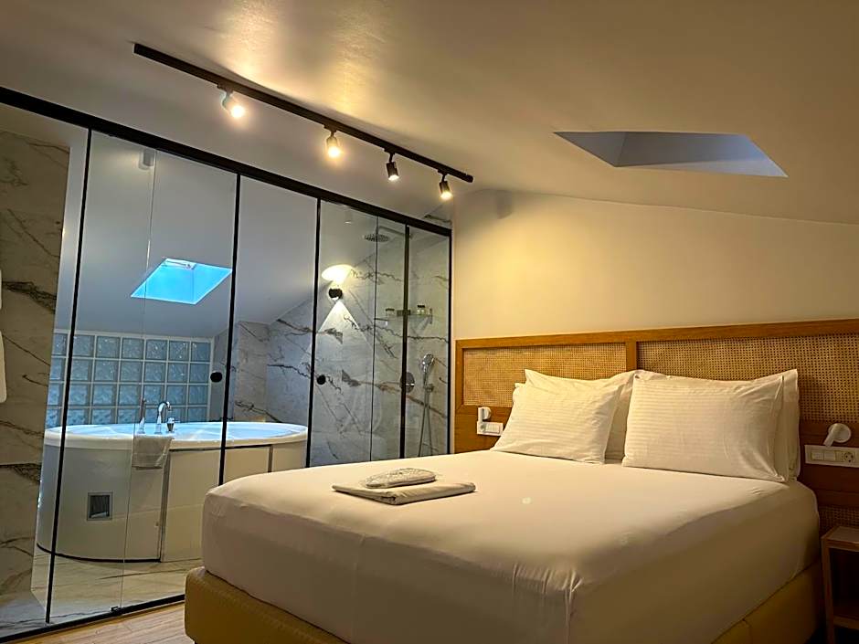 The hotel offers a variety of room types including large double rooms, deluxe double rooms with or without balconies, standard double rooms with or without balconies, duplex quadruple rooms, and suites with a hot tub. All rooms are non-smoking and accommodate 2 adults, except for the duplex quadruple room and the suite, which can accommodate 4 adults. The bed sizes range from a queen size bed to a combination of a queen size bed and a sofa bed.