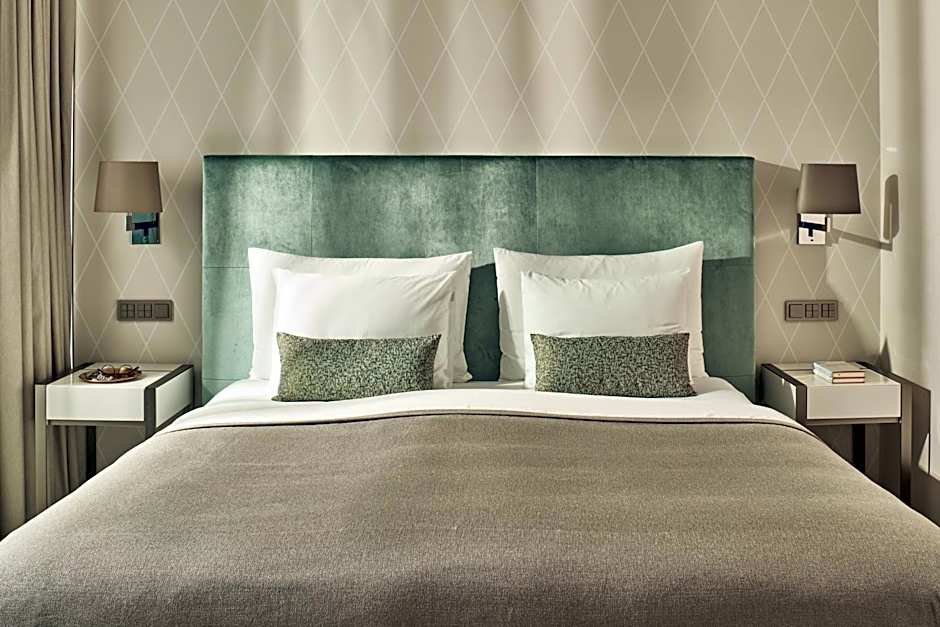 This single room is located on a higher floor and features a queen bed (1.60 x 2.00), floor-to-ceiling windows and a natural stone bathroom. Guests can enjoy a selection of complimentary drinks in the mini-bar.