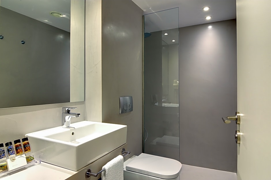 The Double Room with Panoramic Sea View offers unobstructed views to the sea, both from the bedroom and the bathroom with its glass shower cabin made of lime mortar. The room features modern furnishing and minimal decor.