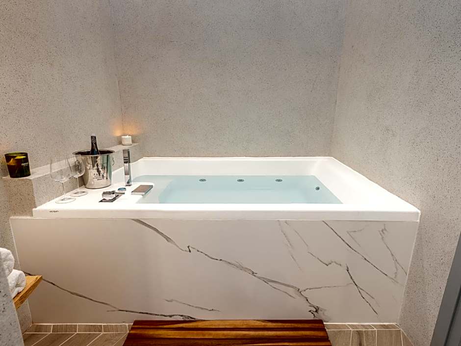 Opening out to balcony with city view, this room has flat screen satellite tv, tea/coffee maker, bathtub and organic amenities