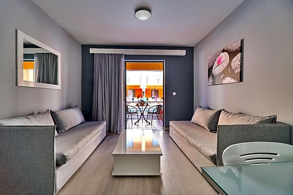 Opening to a balcony with views over the pool, this air-conditioned apartment consists of a separate bedroom and a seating area fitted with purple sofas. Free Wi-Fi and a TV are offered.