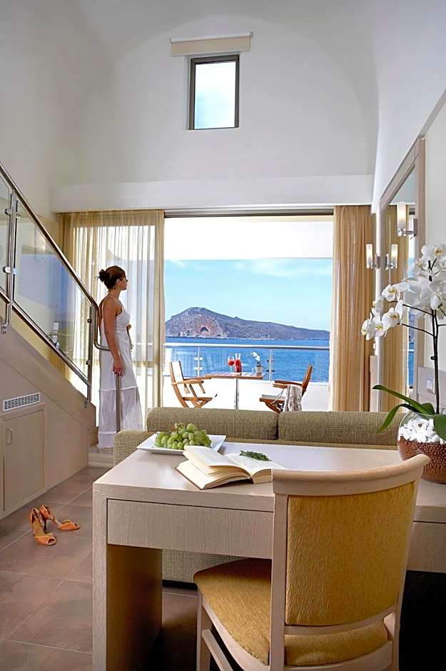 Split-level suite with bedroom upstairs and a sitting area with desk and bathroom downstairs. Features a balcony with sea view.