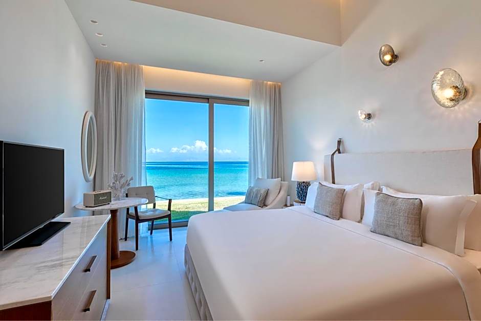 This extravagant, open plan bedroom combines aristocratic luxury and ultimate tranquility with unprecedented proximity to the water. Embellished with elements of naturally fallen wood, statement furniture and bright summer hues of hand-picked artwork, it also features an en suite marble bathroom with pastel mosaic sink, and walk-in shower. Outside your door, a terrace walks on to the private beach and glittering, tranquil bay.