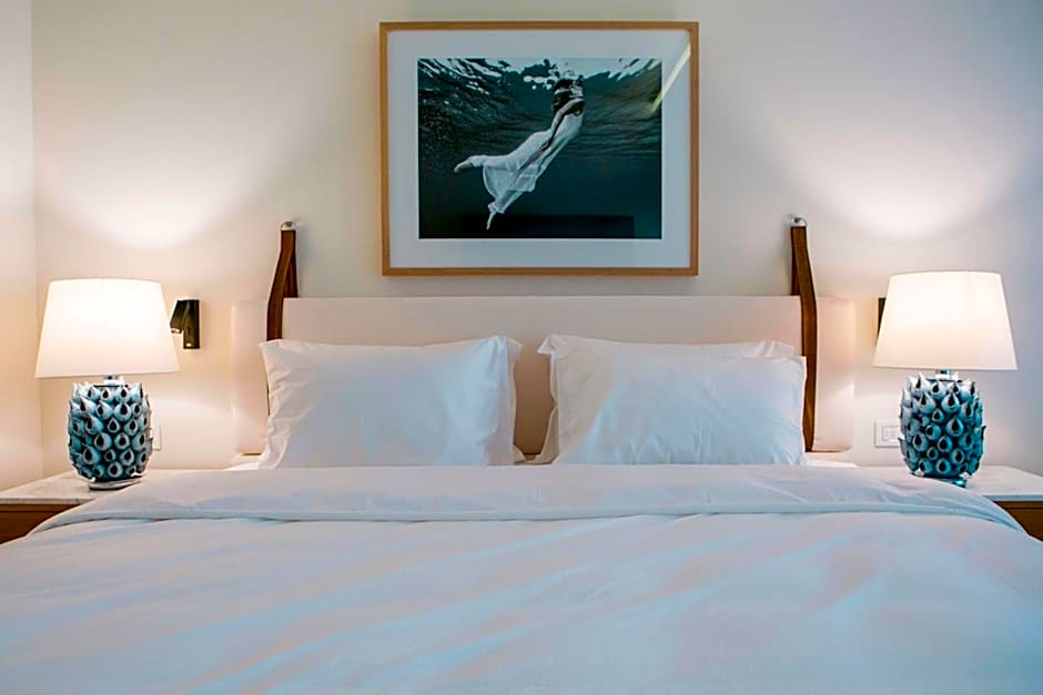 This romantic, open plan hideaway combines aristocratic luxury and ultimate tranquility, with full access to a world-class resort. Embellished with elements of naturally fallen wood, statement furniture and bright summer hues of hand-picked artwork, it also features an en suite marble bathroom with pastel mosaic sink, and walk-in shower. Outside, beyond your terrace, walk across the lawn of a five-century old olive grove to the private beach, main pool, and promenade of restaurants, art gallery and bars.